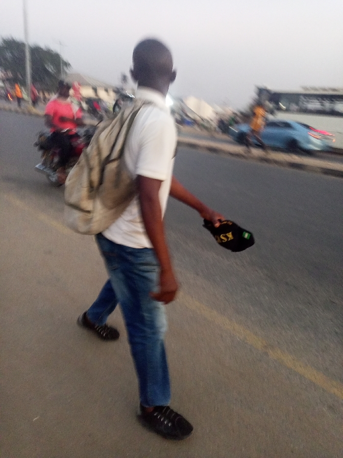 A dark-skinned person walks away from the viewer. They wear a white shirt, blue jeans, and dark shoes. A light tan backpack hangs on their back. The person holds a black baseball cap in their right hand. A road with a yellow line is underfoot. A motorcycle with a person in red is behind the subject. Cars are visible on the road in the distance. Buildings and poles are in the background. The image quality is slightly blurred.