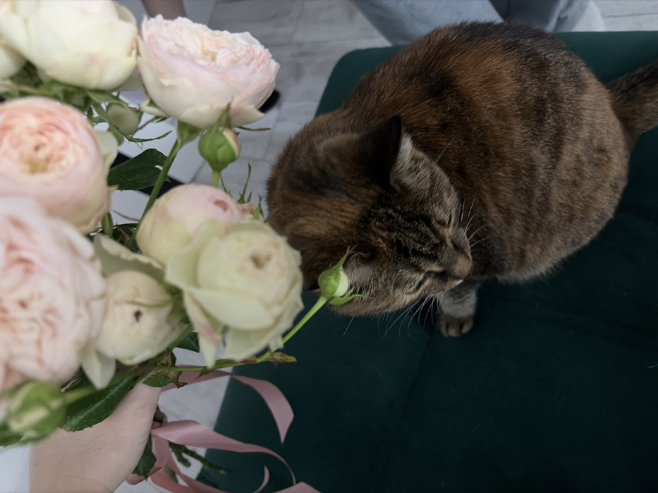 - "A tabby cat sits on a dark green surface, its head close to a bouquet of light-colored roses" by FM-Uq6Av1, licensed under CC BY 4.0