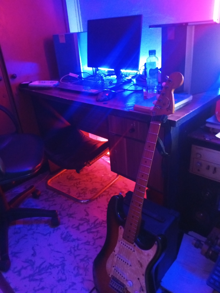 A computer monitor sits atop a cluttered desk in a room illuminated by blue and pink lighting. A laptop, mouse, water bottle, notebook, and speakers share the space. A black rolling chair sits to the side. A sunburst Stratocaster-style electric guitar leans against a black amplifier at the desk's edge. The room appears to be a home studio setup.