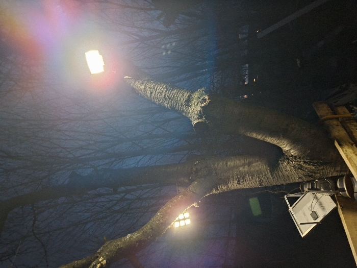 The scene depicts an outdoor environment at night in Moshtanets, Bulgaria. A large, multi-trunked deciduous tree with prominent bare branches dominates the central and upper portions of the image. Two bright, rectangular artificial light fixtures are visible: one is mounted high on an upward-reaching branch on the right, emitting a strong white-yellow glow with significant lens flare; another similar light is positioned lower on the left. Near the base of the tree on the left, a white rectangular panel, possibly a solar panel, is angled with visible wiring, next to a dark, cylindrical object resembling a lantern. A wooden fence structure with horizontal planks runs along the bottom of the image. The background features numerous silhouettes of bare trees against a dark blue-grey sky, with faint, distant artificial lights scattered throughout. No individuals or specific actions are observed.