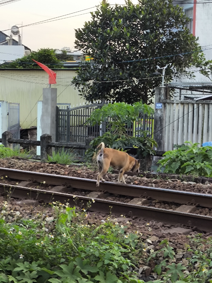- "A light brown, short-haired dog with a visible dark spot on its rear is traversing a double-track railway line in Thành phố Quảng Ngãi, Vietnam" by FM-ETbE83, licensed under CC BY 4.0