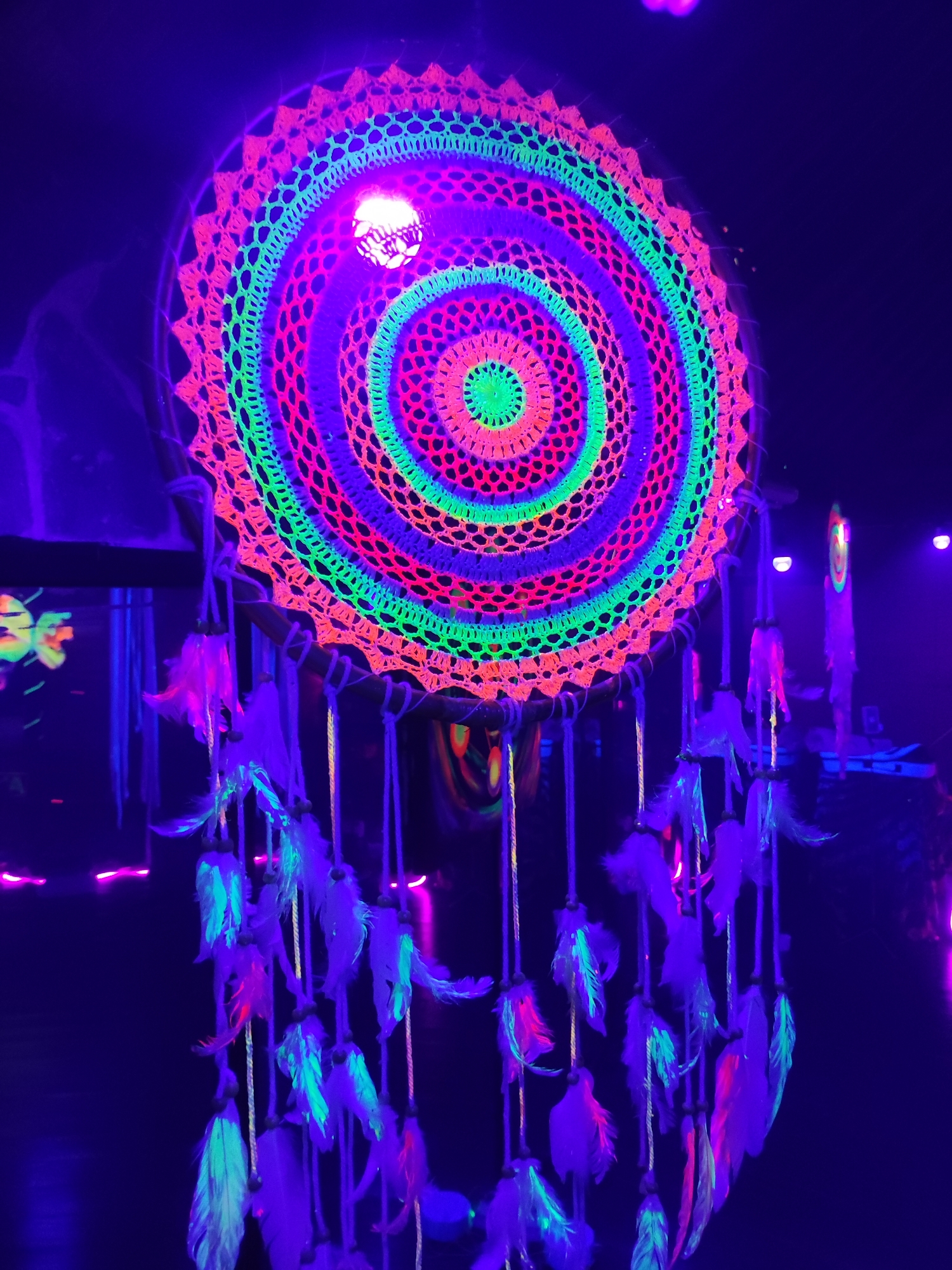 A large, circular, crocheted dreamcatcher is centrally suspended under ultraviolet light, causing its neon-colored threads and attached feathers to fluoresce vibrantly against a dark background