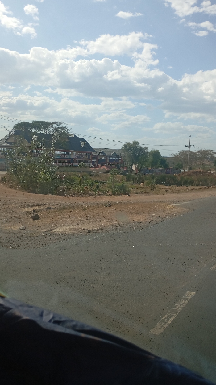 A roadside view shows a building complex with a dark roof and visible signage amidst greenery. The building is likely a hotel or restaurant. A dirt area and a paved road are in the foreground. Above, a bright sky features many fluffy white clouds. The photograph is taken from a vehicle, with a dark fabric or object visible at the bottom.