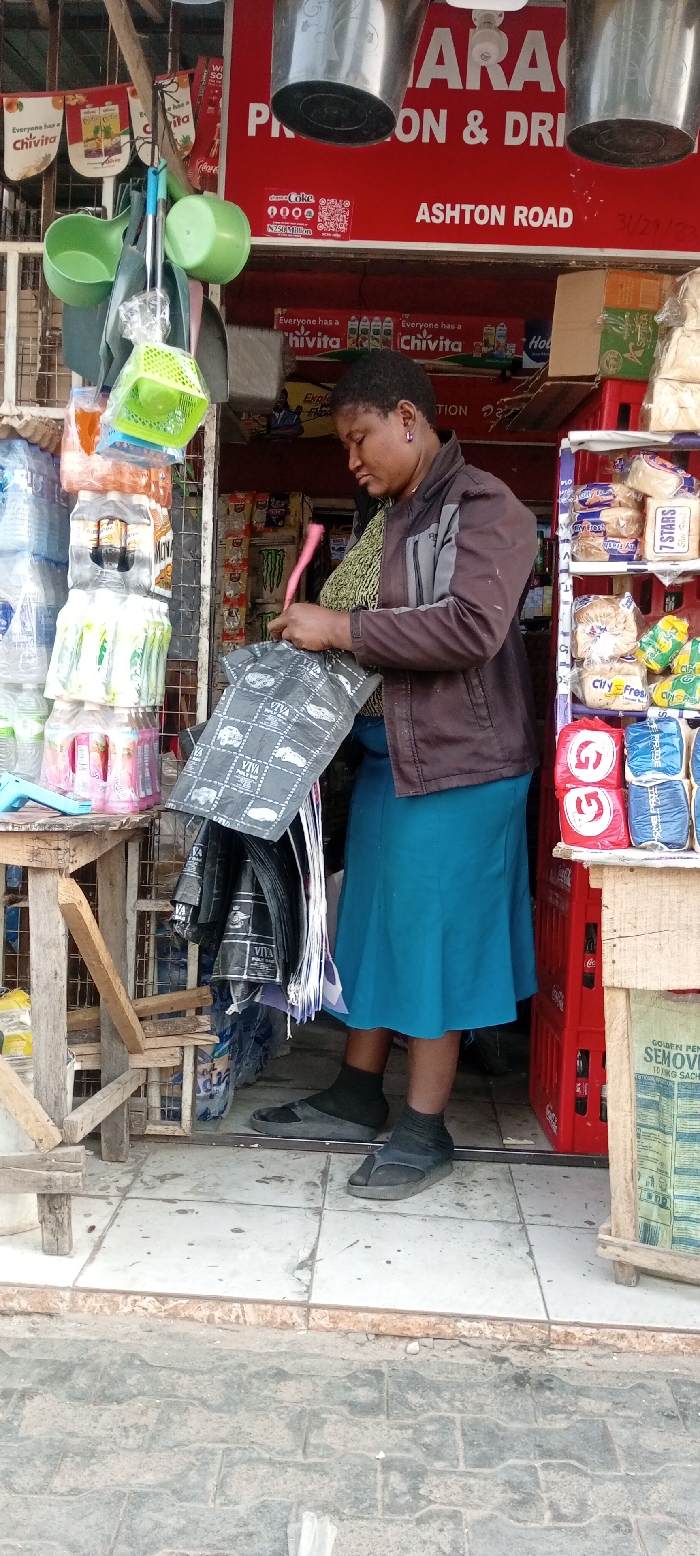 A woman stands in the entrance of a shop, arranging black plastic bags. She's wearing a brown jacket, a blue skirt, and black flip-flops with socks. Behind her, the shop displays a variety of items including water bottles, bread, and Chivita products. A red sign above reads "GARAGE, PROVISION & DRI," with "ASHTON ROAD" below. Metal buckets hang from the ceiling. The shop appears to be a small, local business.
