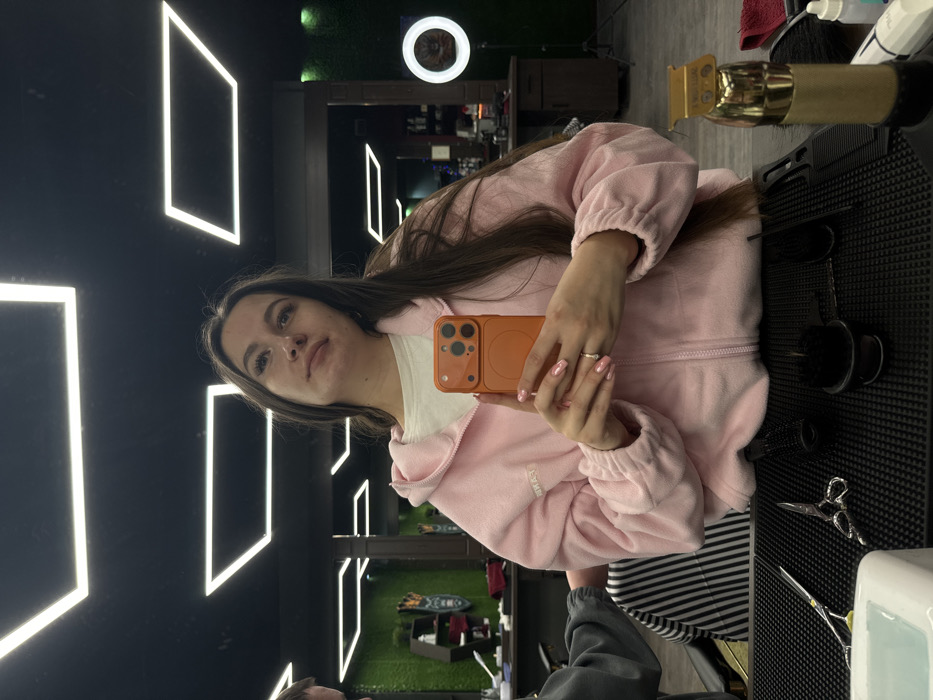 A young woman in a pink fleece jacket takes a mirror selfie in what appears to be a barber shop