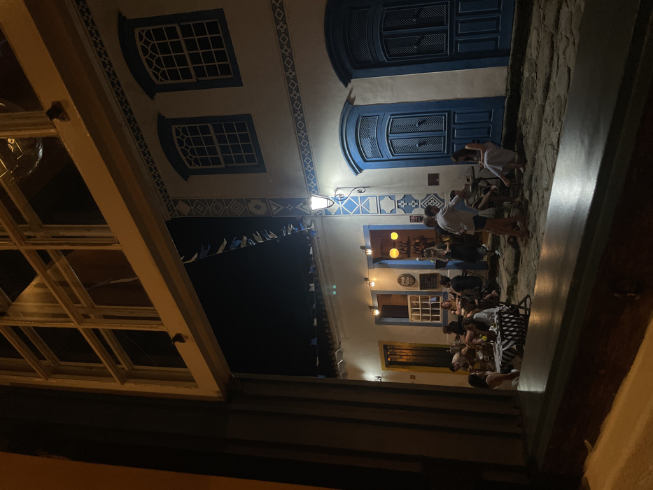 An exterior nighttime view of a building and street scene. The building features white walls with blue accents around windows and doors, along with decorative blue tiles. People are gathered at tables outside a restaurant or bar. String lights hang overhead, illuminating the scene. A wooden window frame is visible on the left side of the image, suggesting the view is from inside a building. The overall atmosphere is lively and inviting.