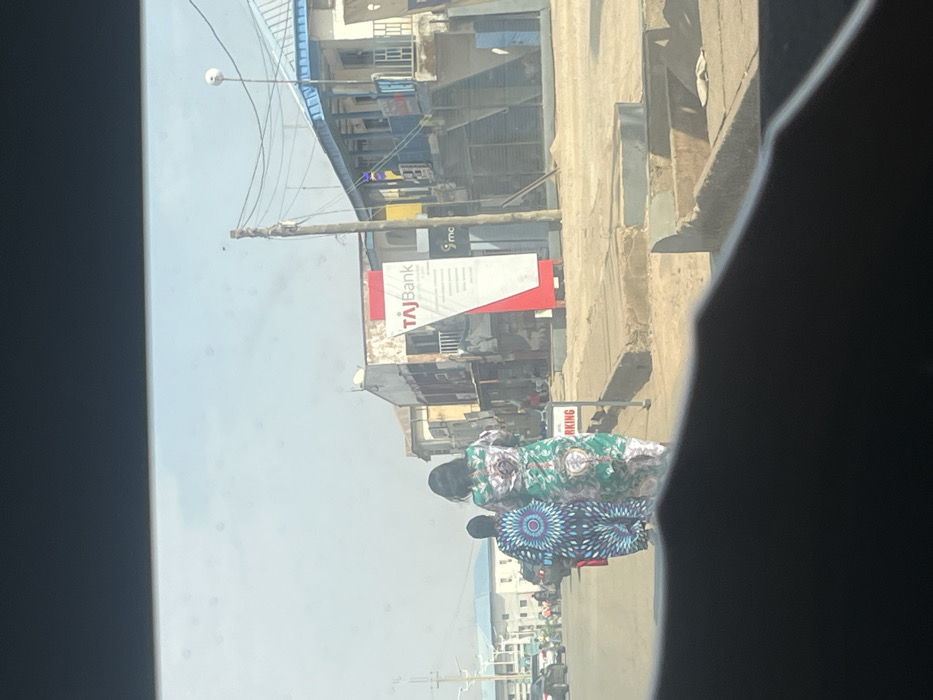The image, captured from a vehicle's interior, depicts an urban street scene in Jos, Nigeria, under a hazy sky