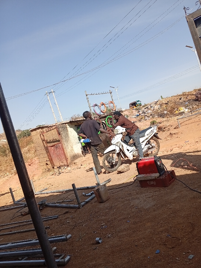 The scene depicts an outdoor, unpaved area in the city of Unknown, Unknown, under a clear blue sky. Two adult males are present on reddish-brown dirt ground. In the center, a male wearing a brown shirt and blue jeans is positioned over a white motorcycle, leaning forward as if performing maintenance. The motorcycle is propped up by rocks. To the right of the motorcycle, a red portable welding machine, labeled "T-IGP," rests on a red plastic crate, with electrical cables extending from it. To the left, a second male, dressed in a dark t-shirt and dark trousers, stands upright, holding a blue object or bag in his left hand. The foreground contains numerous galvanized metal pipes and fittings scattered horizontally on the dirt, along with a metal pole base. In the mid-ground, behind the first man, a small, weathered concrete building with a red metal door is visible. Adjacent to it is a metal display rack holding several colorful circular items. The background features a substantial mound of refuse and debris, with a multi-colored three-wheeled vehicle partially visible on its crest. Overhead power lines and utility poles traverse the upper portion of the frame.