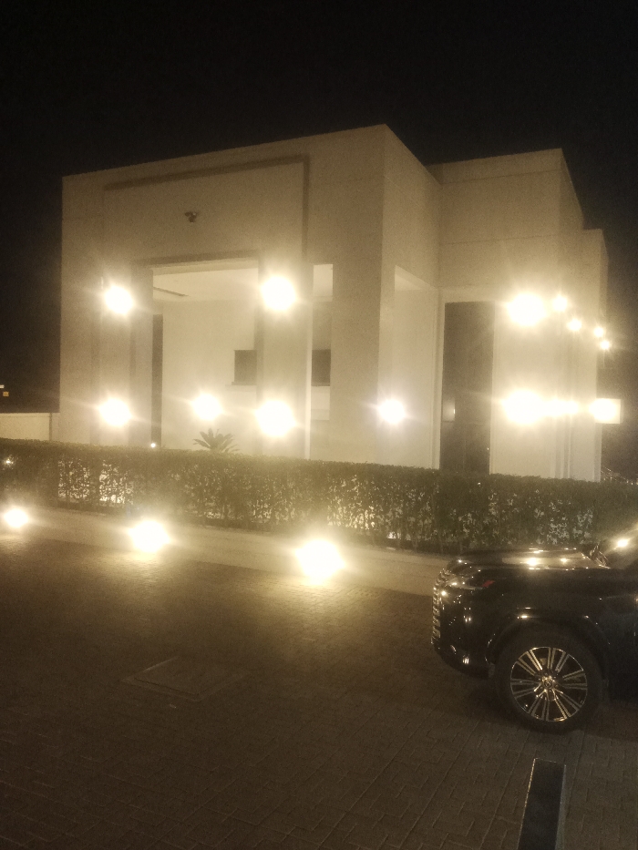 A building with bright exterior lights stands behind a manicured hedge. The building's architecture features a rectangular section with an open entryway and visible interior elements. A dark SUV is parked on a paved area in front of the hedge, its wheel detail visible due to the light. The scene is set at night.