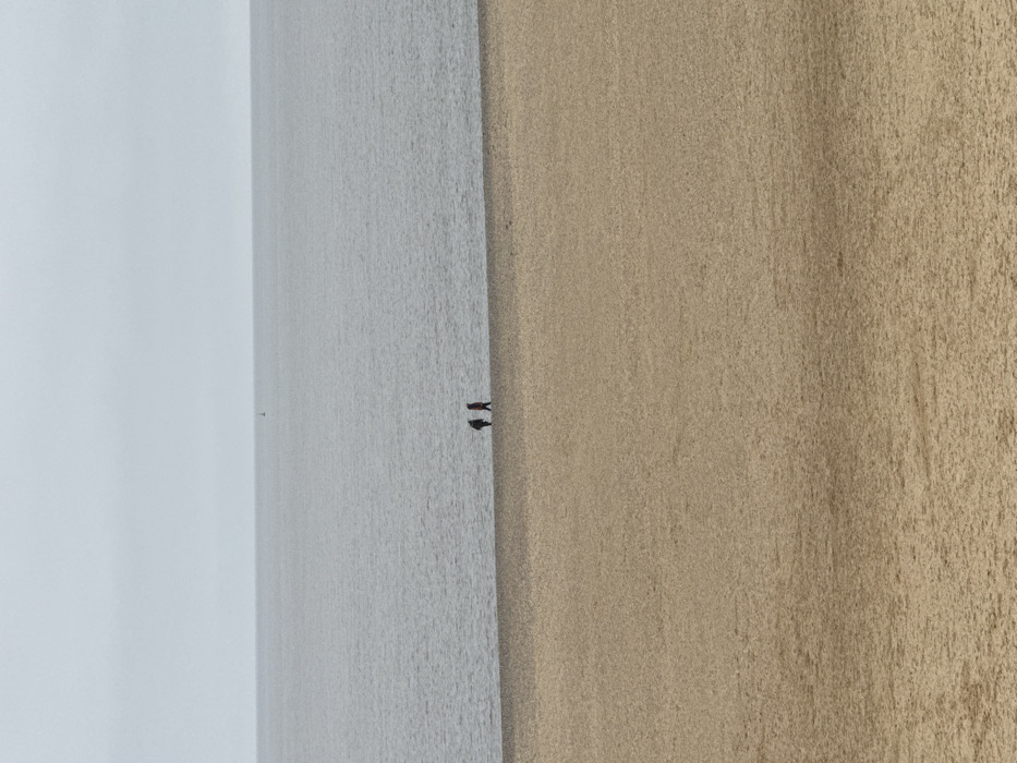 The image presents a coastal scene at Gorleston-on-Sea, United Kingdom, under an overcast, light grey sky that occupies the upper third of the frame. The middle third shows a calm, grey-blue sea, with a solitary, indistinct dark object, possibly a buoy or distant boat, visible on the horizon line slightly left of center. The lower two-thirds of the image consists of a broad, flat expanse of light brown sand. At the interface of the sand and the sea, a narrow band of darker, possibly pebbly material, forms the immediate shoreline. Two human figures, rendered as dark silhouettes due to distance, are present on this darker shoreline strip. The individual on the left appears slightly hunched and is oriented towards the right. The individual on the right is walking towards the right, positioned slightly behind and to the right of the first figure. Both individuals are moving generally in the same direction along the water's edge.