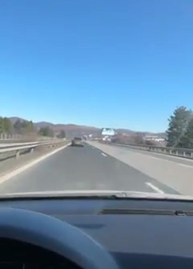 driver's perspective while driving on a highway under a clear blue sky. There are other cars on the road, and trees and hills can be seen in the distance. The dashboard of the car is visible in the foreground.