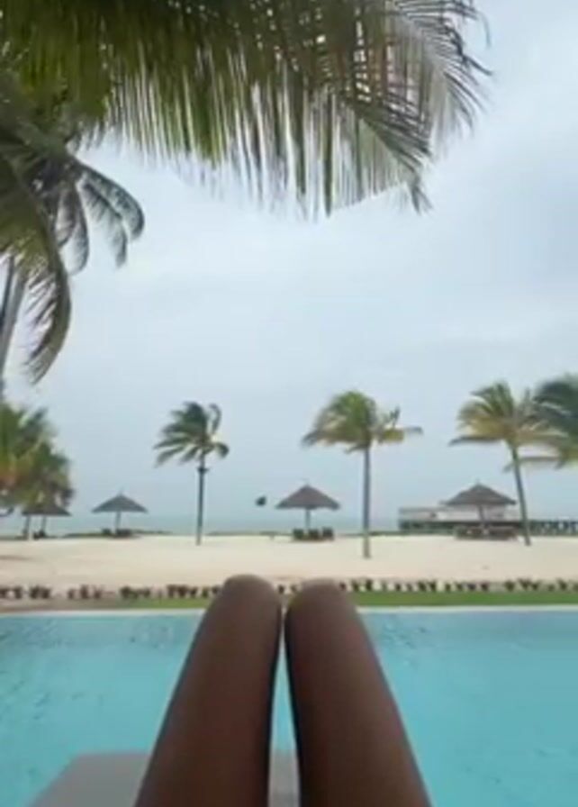 A person is seen lying on a lounge chair by a swimming pool, overlooking a beach on a cloudy day. The person's lower legs are visible in the foreground. Behind the pool, there is a sandy beach with several palm trees swaying in the wind, as well as beach umbrellas. In the distance, a pier extends into the ocean. Palm tree branches frame the top of the video.