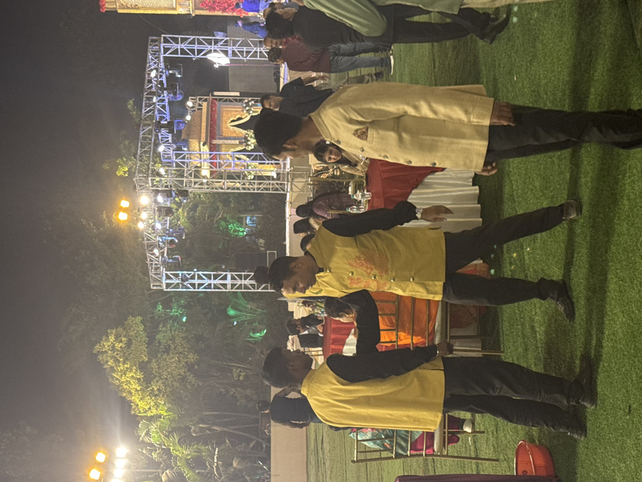 A nighttime event displays a stage structure with lighting and decor. Several people are present, including three men prominently dressed in yellow and black outfits. One man is wearing a beige jacket. They are standing on green artificial turf. Tables with red tablecloths and various event items are visible in the background. Trees and additional structures with lighting are also present.