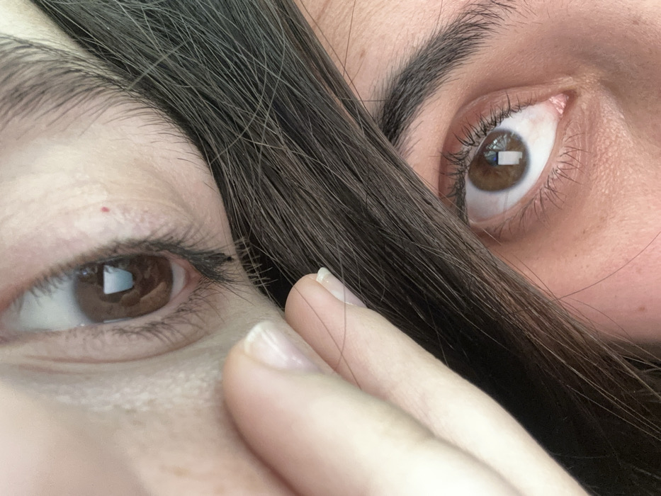 The image displays a close-up, diagonal composition featuring the eyes and surrounding facial elements of two individuals. The upper-left portion of the image shows the right eye of the first individual, oriented as if looking upward. The eye features a medium brown iris with a dark pupil and natural-looking dark eyelashes. The skin around this eye is light-toned and exhibits a small, distinct reddish punctiform lesion (approximately 1mm in diameter) superior to the medial canthus. A bare finger with a clean, unpolished nail is positioned below this eye, appearing to gently touch strands of dark brown hair. The reflection within the iris clearly shows a white rectangular object with a dark upper edge, consistent with a smartphone screen, situated above an indistinct bright area, likely a window or other light source. The lower-right portion of the image shows the left eye of a second individual, oriented as if looking upward and slightly to the right. This eye also has a medium brown iris and pupil, framed by dark eyelashes and a distinct, dark eyebrow. The skin around this eye appears slightly warmer in tone. The reflection in this iris is identical to that in the first individual's eye, displaying the same white rectangular object with a dark upper edge above an indistinct bright area, indicating both subjects are observing the same object or scene. A mass of straight, dark brown hair diagonally bisects the image, visually separating the two faces. This hair appears to belong to one of the individuals, possibly draped across the other. The finger of the first individual is subtly interacting with these hair strands. The discernible reflections in both subjects' irises (a smartphone screen and an ambient light source or window) suggest an indoor setting. The image does not contain any identifiable architectural, cultural, or geographical markers that would allow for the visual confirmation of the location as Yerevan, Armenia.
