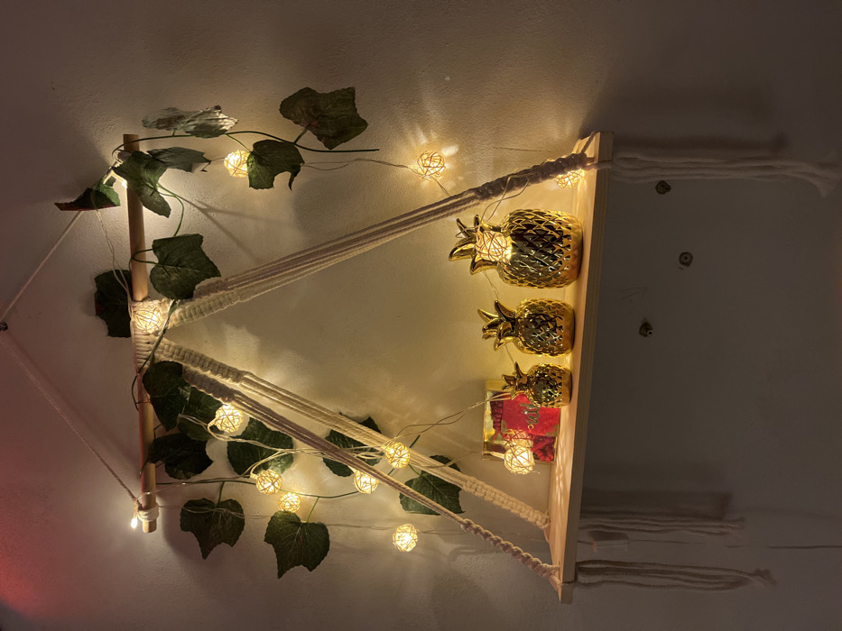 This image depicts a decorative macrame hanging shelf display, situated indoors in Nuseirat, Palestinian Territory. The central feature is a light-colored wooden plank shelf, suspended by cream-colored macrame cords that form two triangular supports from a horizontal wooden dowel. The dowel is attached to a single top cord, fastened to an unseen point above. On the shelf, three golden, textured pineapple-shaped figurines are arranged in decreasing size from right to left. To the left of the smallest pineapple, a small, rectangular red object with yellow details, possibly text or a design, is partially visible. Above and around the shelf, a string of warm white LED fairy lights, encased in spherical, woven rattan-like covers, is draped. These lights are interspersed with artificial green ivy leaves that twine around the wooden dowel and hang down, creating a lush, illuminated effect. The entire arrangement is set against a plain, light-colored wall, which appears to be off-white. The scene is dimly lit, with the primary illumination originating from the fairy lights, casting soft glows and shadows. Two small, dark, circular objects, possibly screw heads or anchors, are visible on the wall below and to the left of the shelf.