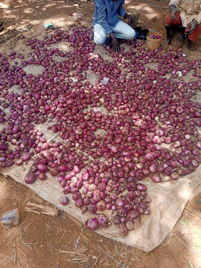 This image depicts an outdoor scene in Zangon Aya, Nigeria, focused on the processing or display of a large quantity of red onions. **Environment:** The scene unfolds on reddish-brown soil, likely unpaved ground. A large, light-colored, possibly beige or off-white, fabric tarp or canvas is spread across the ground, covering a significant area. Partial shade, indicative of overhead tree cover, is visible in the upper left portion of the image, while the rest of the scene is illuminated by natural light, casting subtle shadows. **Subjects and Objects:** The primary subject is a vast collection of red onions, varying in size from small to medium, spread densely over the entire visible surface of the tarp. Many onions appear to retain some dirt or dried outer layers. Two individuals are present in the upper half of the frame. * **Person 1 (left):** A dark-skinned individual is kneeling on the tarp among the onions. They wear a long-sleeved blue collared shirt and light-colored trousers, possibly white or light grey. Both hands are visible, placed directly among the onions, suggesting sorting, gathering, or handling. * **Person 2 (right):** A second dark-skinned individual is partially visible, seated on what appears to be a low wooden stool or block at the edge of the tarp. This person wears a light-colored (possibly white or off-white) garment on their upper body and dark red or brown trousers/wrap. One hand is visible, positioned near some onions. Two woven baskets are visible in the background near the individuals. One larger, empty basket is situated behind the kneeling person. A smaller basket, containing several onions, is positioned near the seated person. **Actions and Interactions:** Both individuals appear to be engaged in the handling of the onions, possibly sorting, grading, or preparing them for sale or further processing. The kneeling individual's hands are actively immersed within the onion pile, while the seated person is positioned ready to interact with the produce. There is no direct verbal interaction evident, but their presence and actions suggest a shared task.