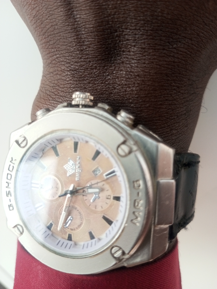 A close-up, slightly overhead shot depicts a dark-skinned individual's left wrist, adorned with a silver-colored wristwatch, against a plain, light background. The watch features an octagonal bezel engraved with "G-SHOCK" on the left and "MR-G" on the right. Its light brown/gold textured dial displays silver hands, white stick hour markers, three sub-dials (including a date window showing "28" at 3 o'clock and a day-of-the-week indicator at 6 o'clock), and a "SUPERK" brand logo below 12 o'clock. A main crown and two pushers are visible on the right side of the case. The watch is secured by a black leather strap, exhibiting signs of wear. A portion of a reddish-maroon garment, likely a sleeve, is visible in the lower foreground. The scene is located in Jos, Nigeria.