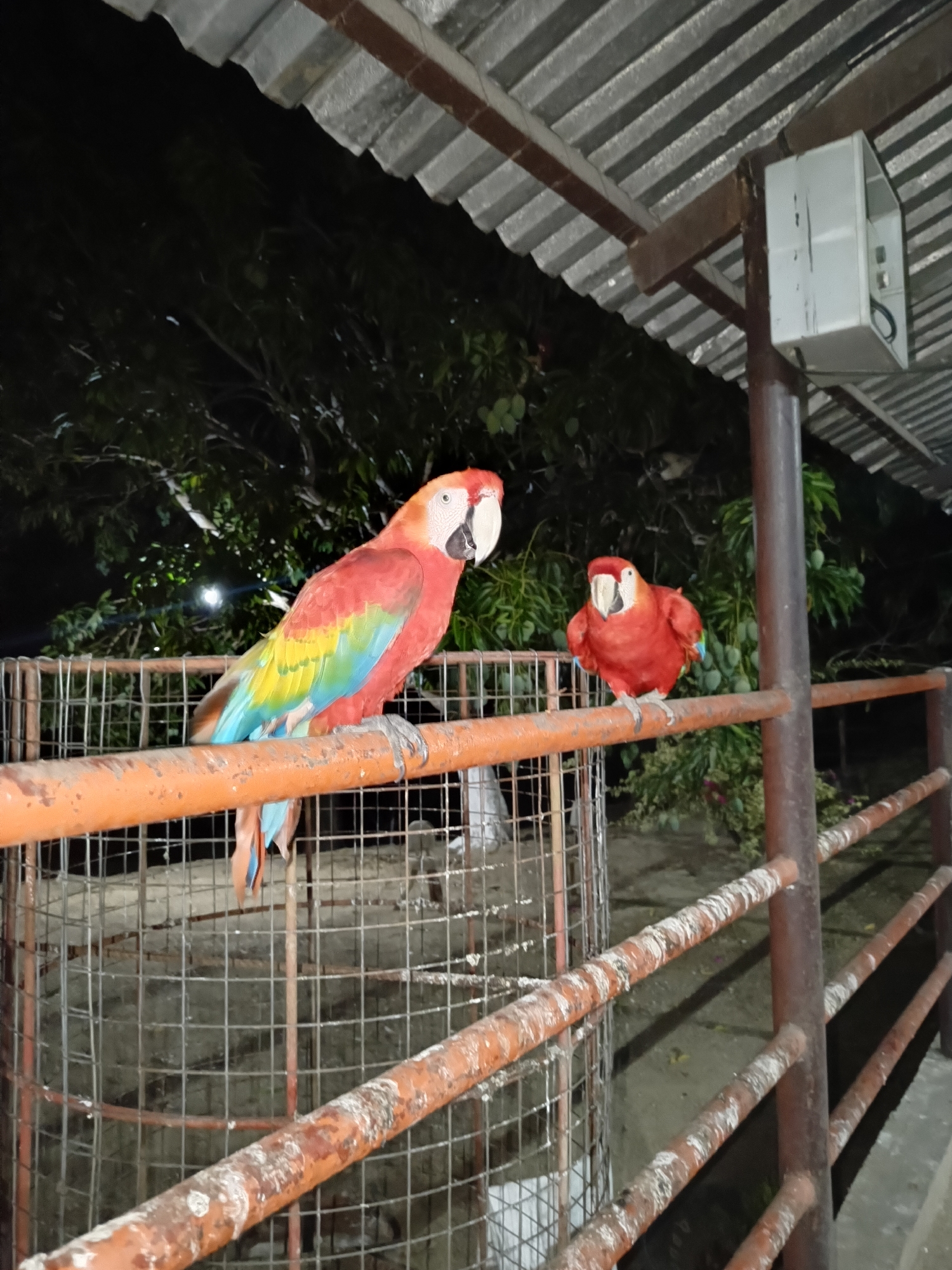 two scarlet macaws perched on an orange metal railing under a corrugated metal roof. Behind the railing is a wire mesh enclosure. It is dark outside, with trees visible in the background. The setting appears to be Los Leoncitos, Venezuela.