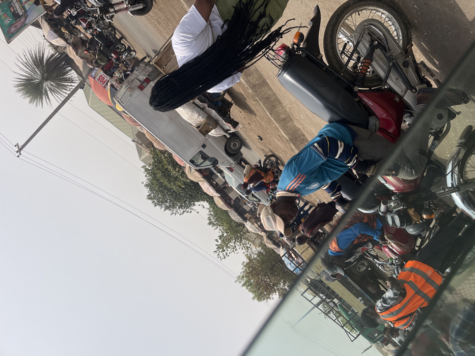 - "This image depicts a bustling street scene in Nyanya, Nigeria, observed from an elevated, angled perspective, likely from inside a vehicle, under a bright, hazy sky" by FM-x1vHr2, licensed under CC BY 4.0