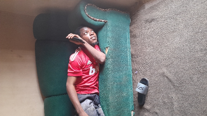 An indoor scene in Akwanga, Nigeria, depicts a male individual lying on his left side on a dark green upholstered sofa