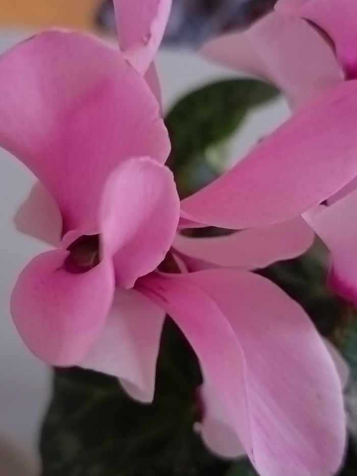 A close-up photograph displays a vibrant pink cyclamen flower, centrally positioned and in sharp focus. Multiple petals, primarily a deep pink hue, are visibly curved upwards and backwards, with some showing lighter pink or white undersides. The center of the flower reveals a darker, possibly reddish-brown pistil or stamen area. In the blurred background, indistinct dark green foliage from the same plant is visible, set against an out-of-focus, light-toned surface. No individuals, overt actions, or interactions are present. The scene is situated in Kamenz - Kamjenc, Germany.