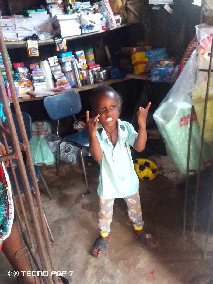 The image depicts a young child standing centrally within a densely packed indoor commercial space, identified as Unknown, Unknown. The child, appearing between 2 and 4 years old, has dark skin and short dark hair, and is dressed in a light blue collared shirt, grey pants with yellow emoji-like patterns, yellow socks, and dark slide sandals. A dark string necklace is visible. The child faces the camera with an open mouth, showing teeth, and both hands raised to shoulder height, forming a "rock-on" gesture with extended index and pinky fingers. The background behind the child features wooden shelving units overloaded with various retail merchandise, including stacks of white paper/notebooks, packaged pens and markers, small bottles, and consumer goods, notably a red package labeled "TOPGUM." To the child's left, two dark blue chairs with metal frames are visible. To the child's right, a yellow and black deflated soccer ball rests on the concrete floor, next to a tall, clear plastic bag containing numerous light green plastic containers, marked "JABOS PLASTIC." Additional packaged items, some yellow and red, are visible on shelves in the upper right background. A dark metal frame extends vertically along the left edge of the foreground, partially obscuring the lower leg and foot of another individual wearing a dark sandal, and a piece of patterned fabric. The floor is an uneven concrete surface. The environment suggests a small, informal retail shop or storage area.