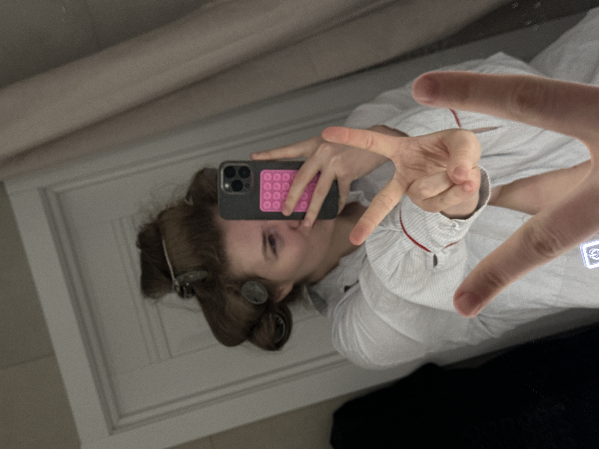 A young woman is taking a selfie in a mirror. She is wearing hair rollers and a white pajama top with red trim. Her phone has a grey case with a pink pop-it fidget toy on the back. She is holding up her hand in a gesture. The reflection reveals part of a white door and a beige surface. It is not possible to ascertain the location in Oktyabr'skii, Russia, from the image.
