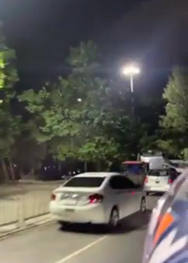 A vehicle travels on a road at night. Street lights illuminate the scene, casting light on the roadside trees. The vehicle passes a security booth with a person inside, several parked vehicles, and an orange traffic cone. The camera's viewpoint appears to be from a motorcycle. The footage is somewhat shaky.