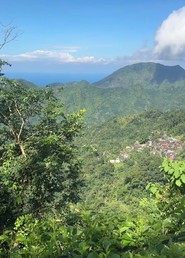 mountainous landscape with lush green vegetation. In the distance, a small village is nestled among the trees. Beyond the mountains, a glimpse of the ocean is visible under a blue sky with fluffy white clouds. The foreground is filled with foliage, framing the view of the mountains and village. The scene is peaceful and serene.