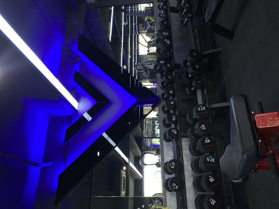 A well-lit gym features rows of black dumbbells of varying weights, ranging from 7.5 to 40 kg, neatly arranged on multiple tiers of a rack. A red weight bench is situated alongside the dumbbell rack. A wall decorated with a black and blue angular design adds a modern aesthetic to the space. The gym also has mirrored walls.