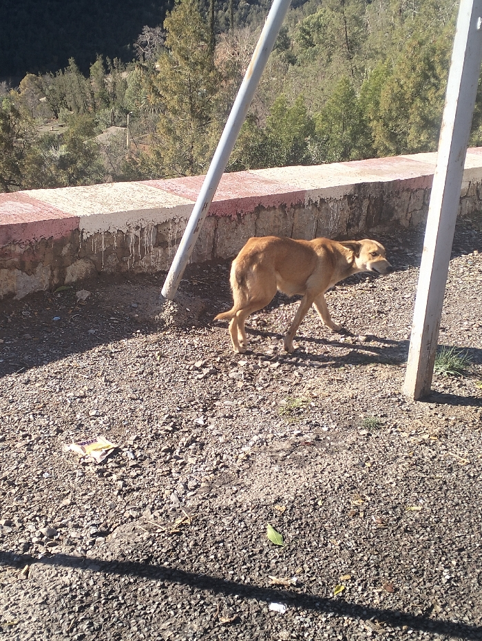 The image depicts a rural or semi-rural outdoor scene in Bin El Ouidane, Morocco, under bright daylight. The foreground is a barren expanse of light-colored gravel and dirt, with an elongated dark shadow traversing the lower portion of the frame from left to right. Visible debris on the ground includes a single green leaf, small twigs, and a crumpled piece of yellow and purple paper or cardboard. A light brown or tan-colored dog is positioned in the midground, walking from left to right across the gravel. The dog has short fur, its ribs are somewhat visible, and its head is turned to the right with its mouth slightly ajar. Two light grey metal poles are present; one extends diagonally from the lower-left foreground towards the center-top, partially obscuring the dog, and another vertical pole stands to the right of the dog. Behind the dog and poles is a low stone retaining wall, approximately waist-height, topped with a concrete coping painted in alternating horizontal stripes of white and faded reddish-pink. Below the coping, the stone wall shows white drip marks. The background features a densely forested landscape of evergreen trees covering a sloping hillside or mountain.