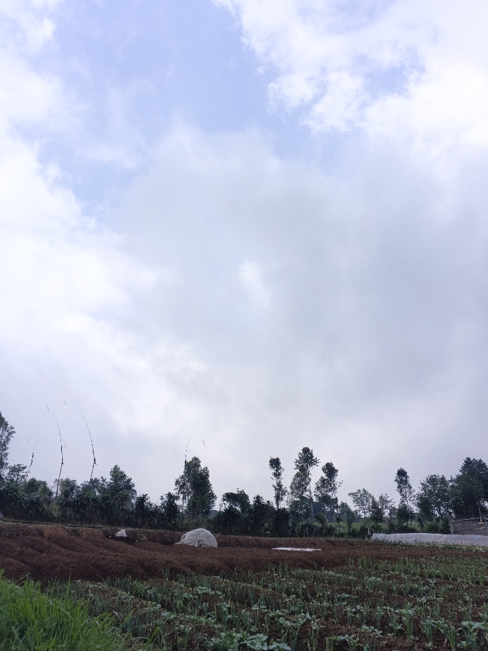 A landscape with a cultivated field taking up the foreground. Rows of green crops line the lower portion. Behind this, a patch of brown earth with a couple of covered mounds. A line of trees forms the horizon. Overhead, a cloudy sky, mostly overcast but with some patches of light blue visible. The overall scene suggests a rural, agricultural setting under a slightly gloomy sky.