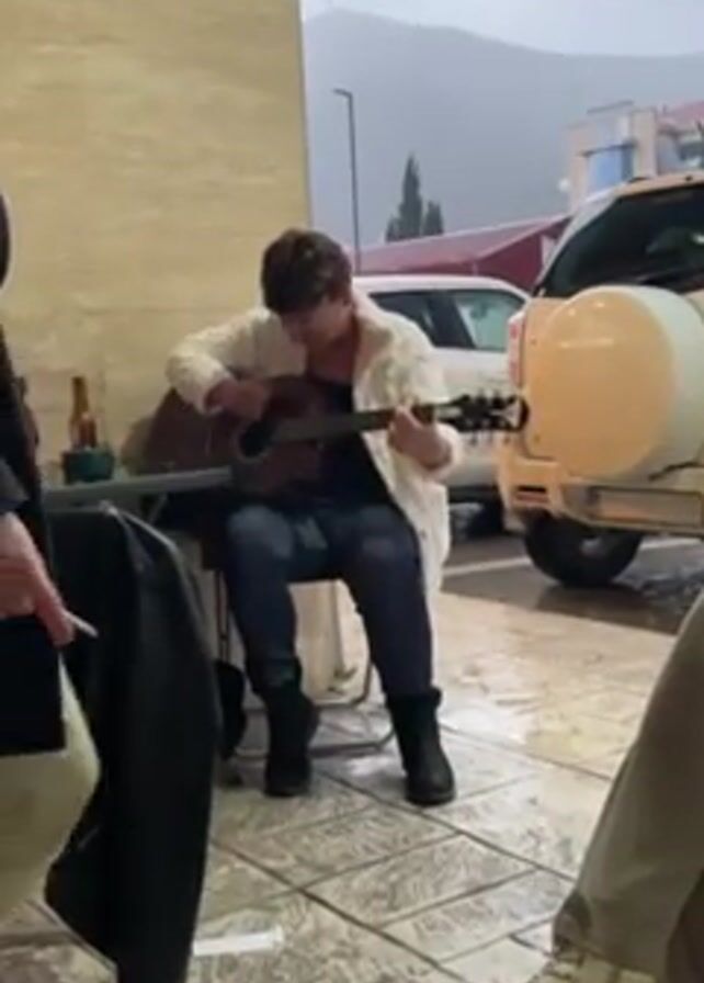 person playing guitar outdoors, sitting in a chair on a tiled surface. They are wearing jeans, black boots, and a white sweater over a dark top. Several people are standing around, listening. One person in a black coat walks by. Behind them are parked cars and a mountain is visible in the distance under a cloudy sky. A table with bottles and a jacket is to the left of the guitarist. The crowd cheers after the guitarist finishes a phrase.
