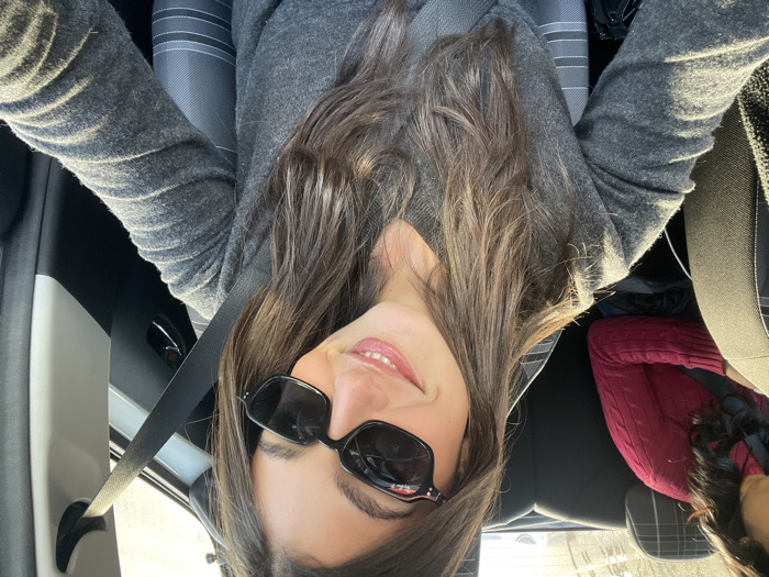 A forensic examination of the image reveals a scene inside a vehicle in Aix-en-Provence, France. The primary subject, a female with long brown hair, is positioned in the front passenger seat, looking directly at the camera with a slight smile. She wears dark sunglasses and a grey long-sleeved sweater, secured by a black seatbelt across her chest. To her left, partially visible in the rear seat, is another female. This individual wears a burgundy cable-knit sweater and a black seatbelt, with only the back of her head and left shoulder discernible as she looks downwards. The car's interior features grey patterned upholstery on the seats. Strong sunlight is present, casting highlights on the subjects and reflecting off the sunglasses, indicating an outdoor setting during daylight hours. The background visible through the rear window is blurred, suggesting the vehicle is in motion or has an indistinct environment behind it.