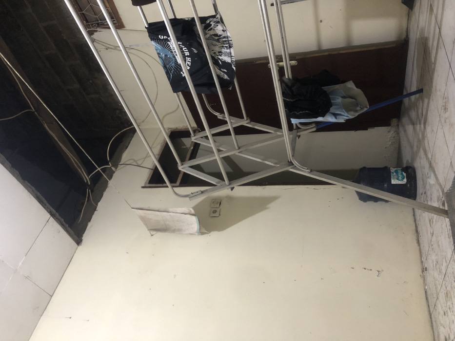 The image displays an indoor utility space within the city of Unknown, Unknown. A silver-colored, collapsible clothes drying rack stands prominently in the mid-ground, holding a black t-shirt with a white graphic and partial text ("YOUR HEA"), and several dark garments including light blue underwear. The room's walls are light beige, exhibiting wear, dirt, and some cracking, particularly near the floor level. A white and light blue striped towel hangs on the left wall above a white double electrical outlet. The ceiling is partially finished with white panels on the upper left, transitioning to an exposed area on the right revealing concrete blocks, numerous white and dark electrical wires, and a dark overhead void. A dark, rectangular opening, potentially a doorway without a door, is visible behind the drying rack. On the tiled floor in the lower-left, a large, dark blue plastic water dispenser bottle labeled "Supere" is present. The floor appears soiled. No individuals are depicted in the scene.