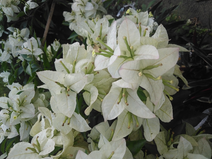 In El Nayar, Mexico, a close-up, high-angle photograph captures a dense proliferation of white bougainvillea. The image is dominated by numerous clusters of white, papery bracts, typically arranged in groups of three, surrounding small, inconspicuous light green to pale yellow flowers. Prominent green stamens extend from the center of these flowers. Some bracts display a faint pinkish tint along their edges. Dark green bougainvillea leaves are visible among the blossoms, and darker, possibly reddish-brown foliage is present in the lower portion of the frame. The background consists of out-of-focus green vegetation and shadowed areas, with a narrow strip of dark, textured ground or paved surface visible along the right edge. No individuals or animate subjects are depicted.