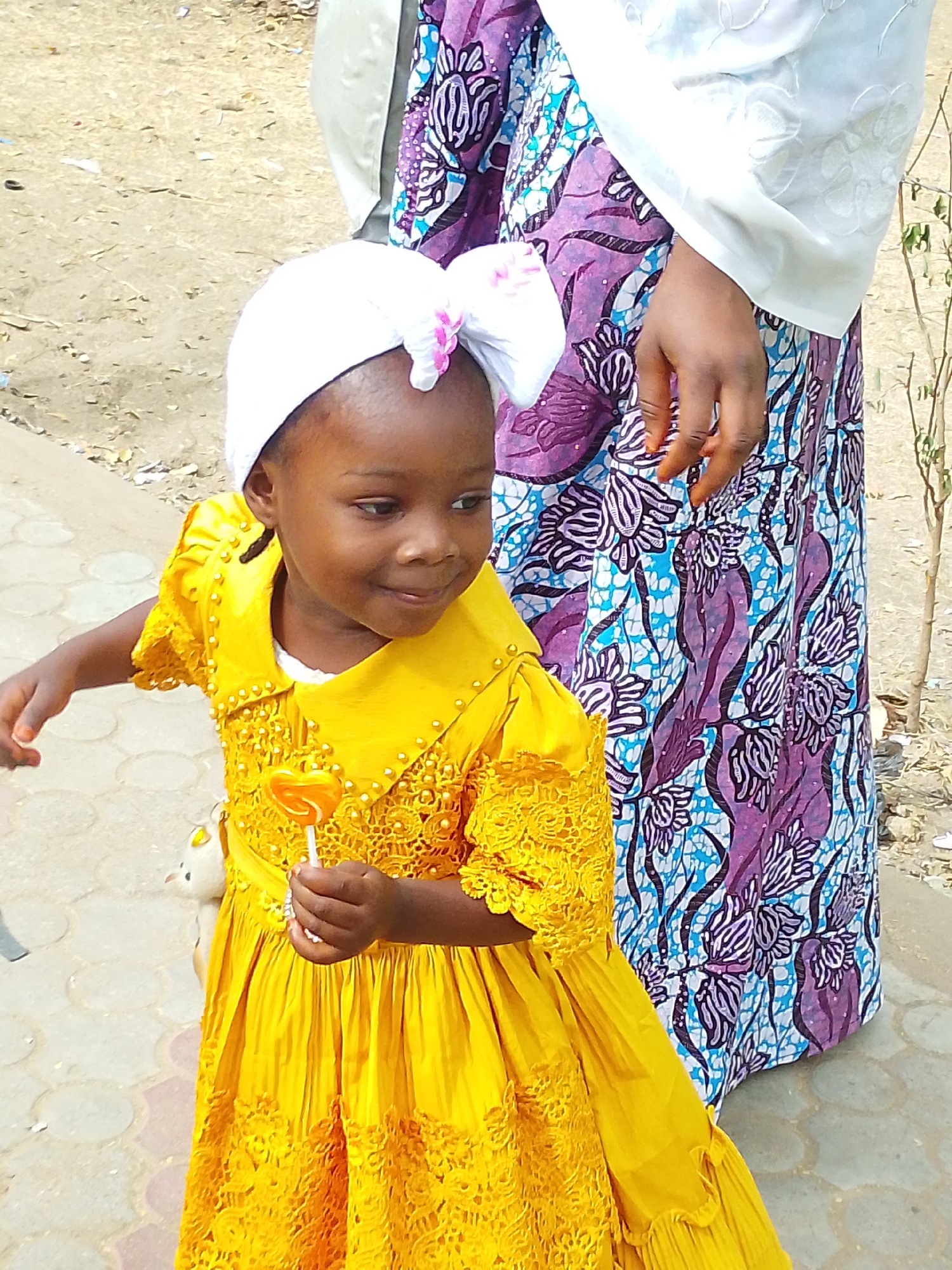In Garun Gawa, Nigeria, a young girl in a yellow dress stands holding a lollipop. She wears a white head covering with a pink bow. To her right stands an adult woman in a colorful printed dress with a white top. They are on a paved surface near a dirt area. The girl is looking to the side.