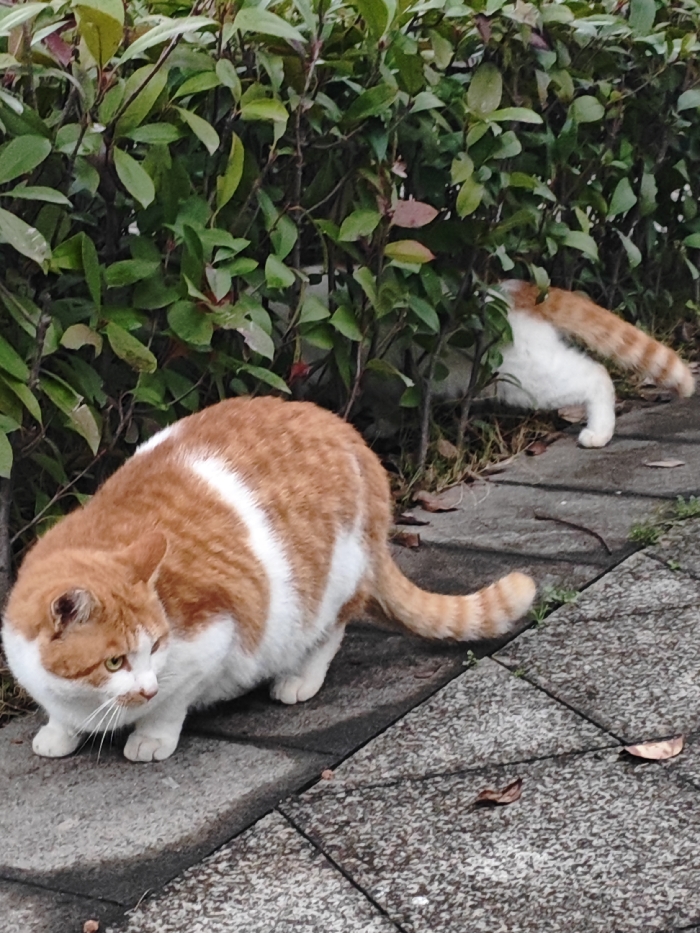 The scene is set outdoors in the Chongqing High-tech Zone, China. The primary subject is a large, orange and white bicolored cat, positioned on a grey paved pathway in the foreground. This cat, with a distinctive white vertical stripe on its side and yellow-green eyes, faces left and looks downwards. Behind it, partially concealed by a dense green hedge, are the hindquarters of a second cat, exhibiting white fur and a striped orange tail. The hedge consists of green foliage with some reddish-brown leaves. The pathway is constructed from textured grey pavers, interspersed with scattered dry leaves and small weeds. The environment is illuminated by natural daylight.