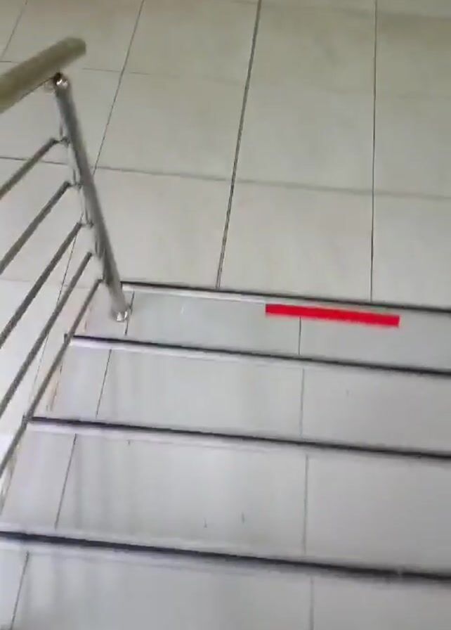 A person in brown shoes and camo pants walks down a set of stairs. The stairs have white tile steps with a gray metal rail along the side. There is a red strip of tape on one of the steps. The wall is off-white and tiled. The camera follows the person's feet as they descend.