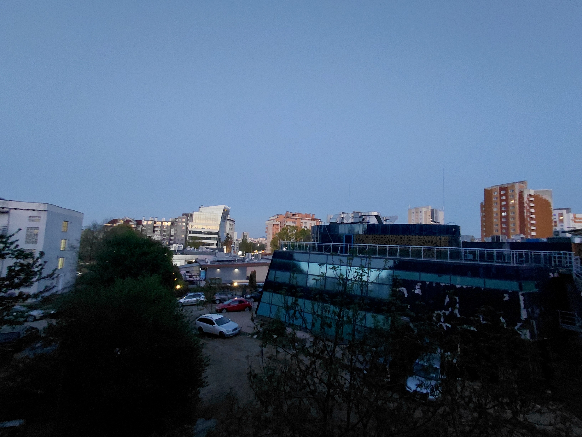 n urban scene at dusk in Sofia, Bulgaria. The sky is a pale blue, transitioning to darkness. A variety of buildings are visible, ranging from low-rise residential structures on the left to taller apartment buildings in the distance on the right. One building features a modern glass facade with reflective surfaces. A parking lot in front of the glass building contains several cars. Foreground elements include trees and branches, which are silhouetted against the brighter background and obscure the view. The overall scene is quiet and still.