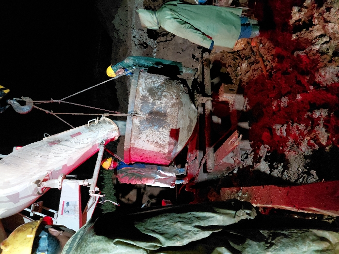 At night, construction workers in hard hats and rain gear work with a large metal bucket suspended by cables from a crane