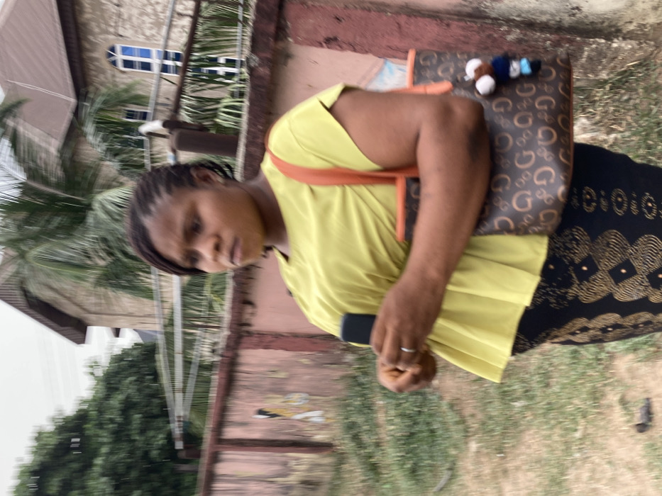 A woman is depicted standing outdoors in Aba, Abia, Nigeria, on an overcast day. She appears to be in her late 20s to early 30s, with dark skin and dark braided hair. She wears a light yellow, short-sleeved top with a pleated hem and a dark skirt featuring a gold geometric pattern. A silver-colored ring is visible on her left ring finger. She holds a dark-colored feature phone in her right hand. A brown shoulder bag with a repeating 'G' logo and orange trim hangs from her left shoulder, adorned with a small, multi-colored keychain. Her gaze is directed towards the left side of the frame, with a neutral expression. In the background, a faded reddish-pink wall with faint artwork is visible. Above the wall, a metal fence structure precedes a two-story building with a brown roof and arched, blue-tinted windows. Lush green foliage, including palm fronds, is present throughout the background. The ground in the foreground is unpaved earth with sparse vegetation.