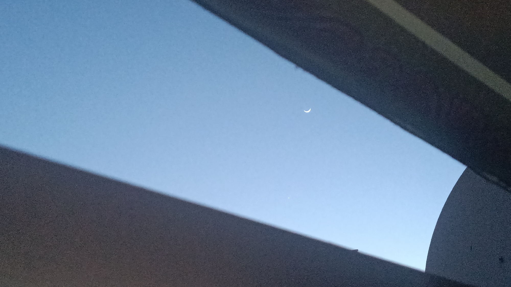 The sky is visible through a gap, framed by dark, structural elements. The sky's color ranges from a light blue at the top to a slightly darker blue towards the bottom. A crescent moon is visible in the upper part of the sky, while a small, bright dot, possibly a star or planet, is seen lower down. The dark structures give the impression of looking through a window or opening.