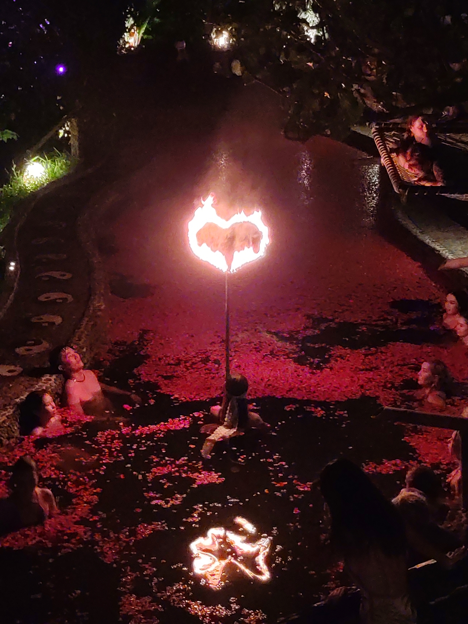 The image depicts a nighttime scene in what appears to be a luxurious outdoor bathing area, possibly a part of a resort or spa in Blahbatuh, Indonesia. The central focus is a body of water heavily adorned with red rose petals, creating a vibrant and romantic atmosphere. Several individuals are immersed in the water, with some appearing to be relaxing or conversing. The presence of rose petals around them suggests that they are enjoying a bath or soaking experience. Illumination is provided by multiple light sources, including a tall torch-like structure with a flaming heart shape at its top, which casts a warm and dramatic glow across the scene. Another burning torch lies in the water, adding to the unique atmosphere. Fairy lights are observed in the trees in the background. A separate area with steps leads away from the bathing area to the top left, while another area to the top right contains a chaise lounge with a figure reclining on it. The scene creates an intimate and exotic environment.