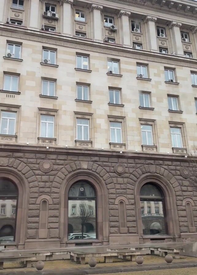 The camera pans upward in front of a light-colored building with many windows, columns, and arched entryways
