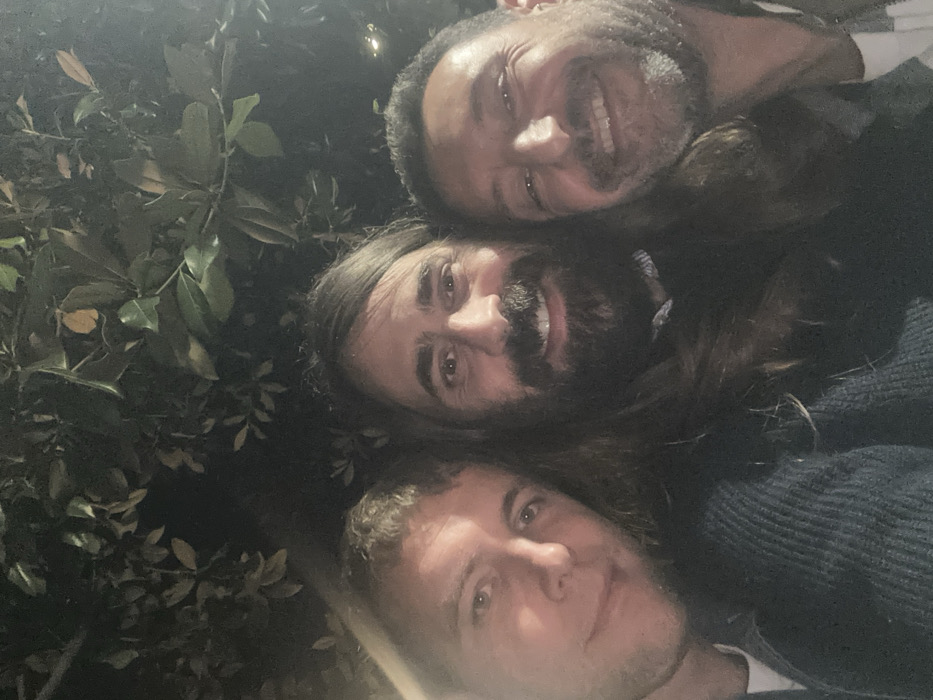 A night-time, low-angle group selfie captures three adult males positioned closely together against a dark, out-of-focus background of dense foliage