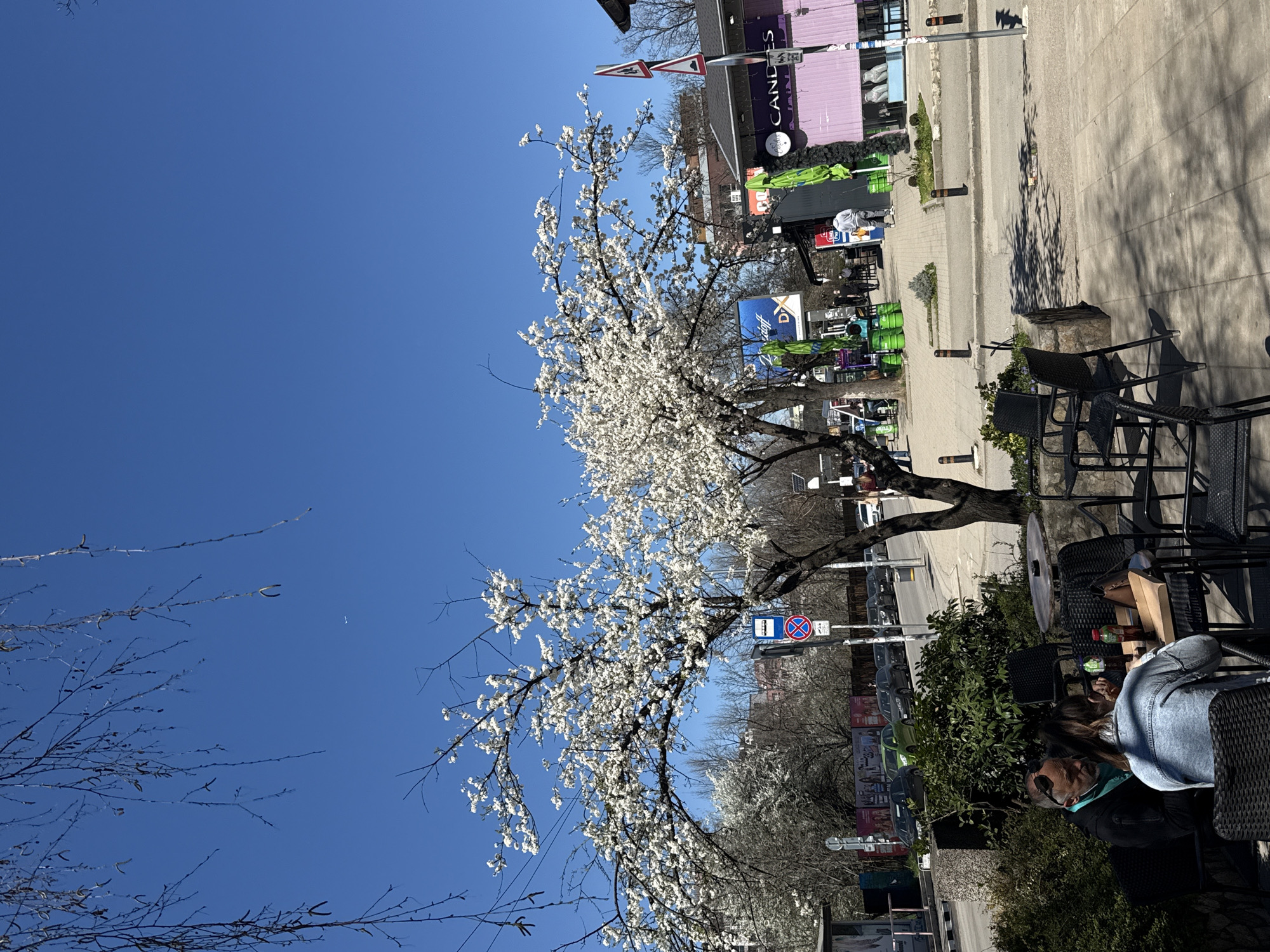 street scene in Sofia, Bulgaria, during daylight. A flowering tree with white blossoms is in the foreground. Behind the tree is a street with cars and pedestrians. Several businesses can be seen. On the right side of the image, there are tables and chairs with people sitting at them. A woman in a denim jacket is seated at one of the tables. Street signs and other signage are visible. The sky is clear and blue.