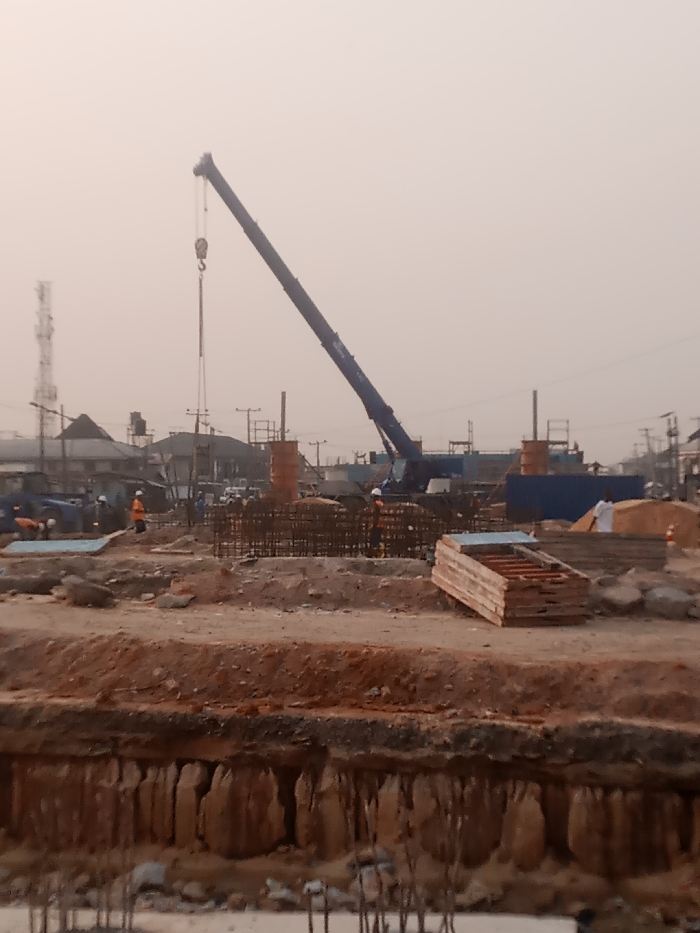 A construction site features a blue crane with its boom raised, positioned near rebar cages and cylindrical forms