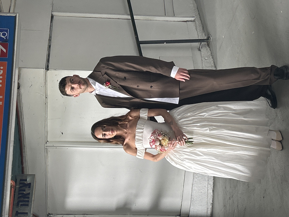 The image displays two individuals, a female and a male, standing formally posed within what appears to be a train station in Tel Aviv, Israel. Overhead signage includes Hebrew text "יציאה ד'" (Exit D), "W.C.", an arrow, and a wheelchair accessibility symbol, indicating a public transit environment. The female subject, positioned on the left, is Caucasian, approximately 20-30 years old, with long, wavy brown hair. She is attired in an off-the-shoulder, off-white wedding gown featuring a ruched bodice and a voluminous, pleated skirt. She wears light-colored flat shoes. Tattoos are visible on both forearms. She holds a bouquet of pink and white roses with green foliage in both hands at waist height. Her gaze is directed neutrally towards the camera. The male subject, positioned on the right, is Caucasian, approximately 20-30 years old, with short brown hair and a neatly trimmed beard. He wears a dark brown double-breasted suit jacket over a white collared shirt (partially visible below the jacket hem), matching dark brown trousers, and black dress shoes. A red and white floral boutonnière is pinned to his left lapel. His gaze is directed neutrally, slightly to the right of the camera. Both individuals stand on a light gray, possibly concrete, floor. The background consists of light-colored, paneled walls, and a dark metal handrail is visible on the right side of the frame. The lighting is even and diffused.