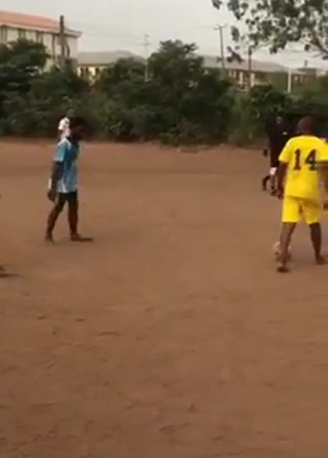 A wide, eye-level shot depicts a soccer game on a dirt field